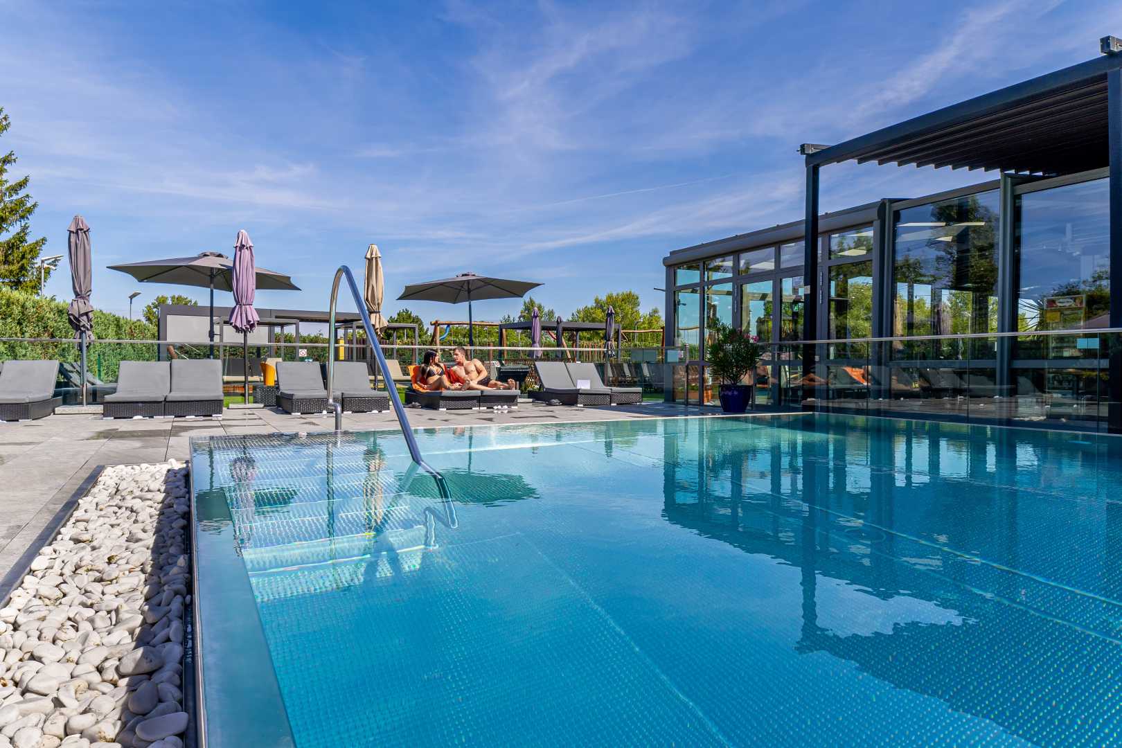 Okolí bazénu je navrženo pro maximální pohodlí – k dispozici jsou lehátka, slunečníky, hotelové plážové ručníky i prostorná sluneční terasa. Rodiny s dětmi potěší také blízké dětské hřiště, které rozšiřuje možnosti trávení volného času.