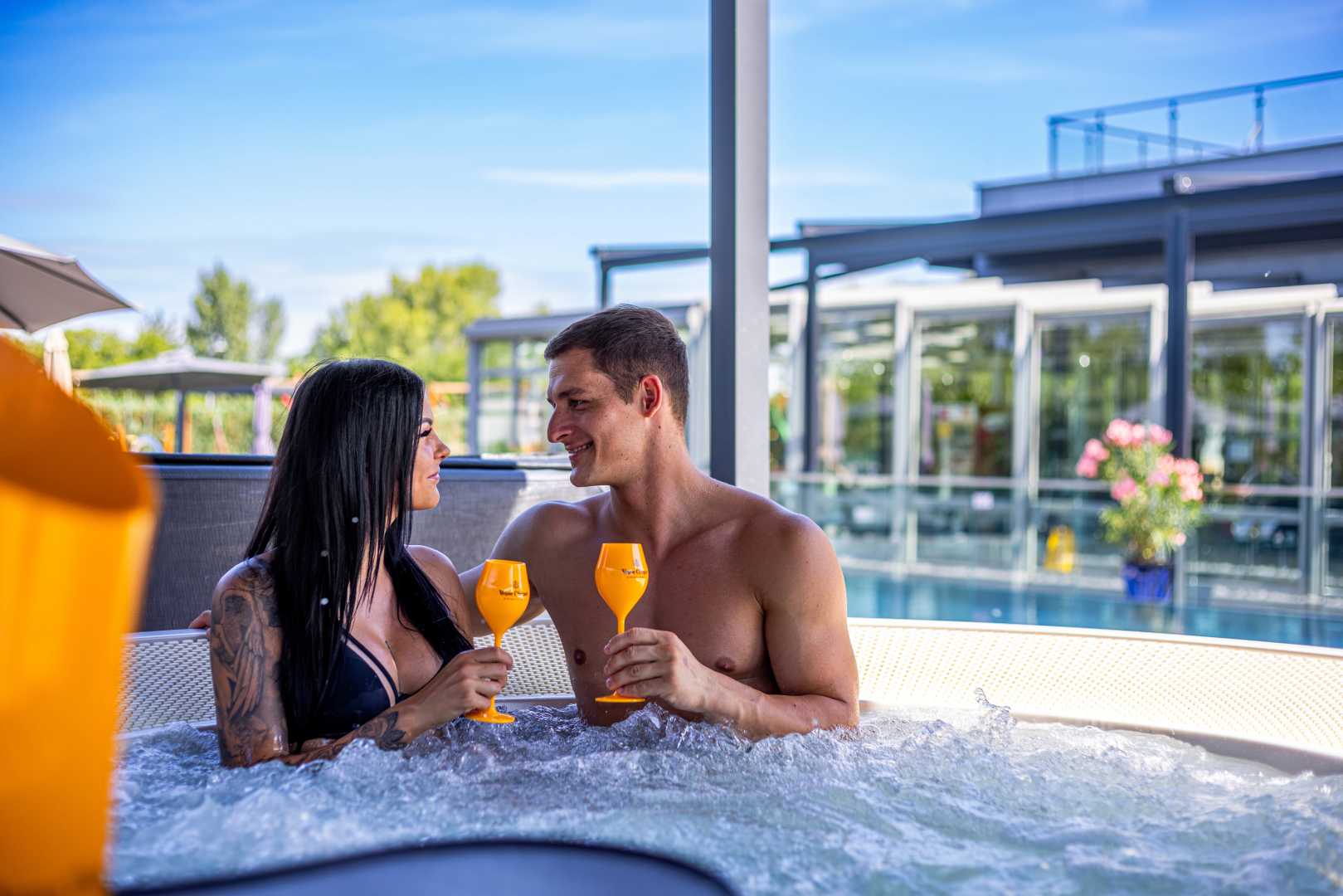 Součástí areálu je také venkovní vířivka, která je k dispozici po celý rok. S příjemnou teplotou 36 °C si ji můžete vychutnat i během chladnějších dnů a dopřát si relax pod širým nebem. Bazén je v provozu od dubna do října a vyhřívaný na komfortních 27 °C.